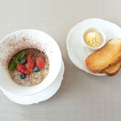 Каша рисовая с изюмом и черносливом, грилованная семга с теплым сливочным шпинатом, яйцами пашот на хрустящем пшеничном тосте, подается с зеленым микс салатом и томатами черри