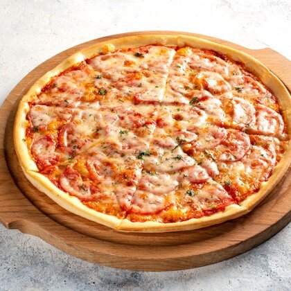 Соус барбекю, охотничьи колбаски, помидоры, зелень, сыр "Моцарелла"