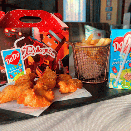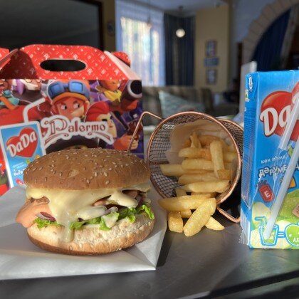 Хрустящие чебуреки с курицей, золотистые наггетцы, сочные крылышки, порция картофеля фри, маленькая, но очень вкусная, два соуса, для яркости вкуса 1 литр Coca Cola в подарок