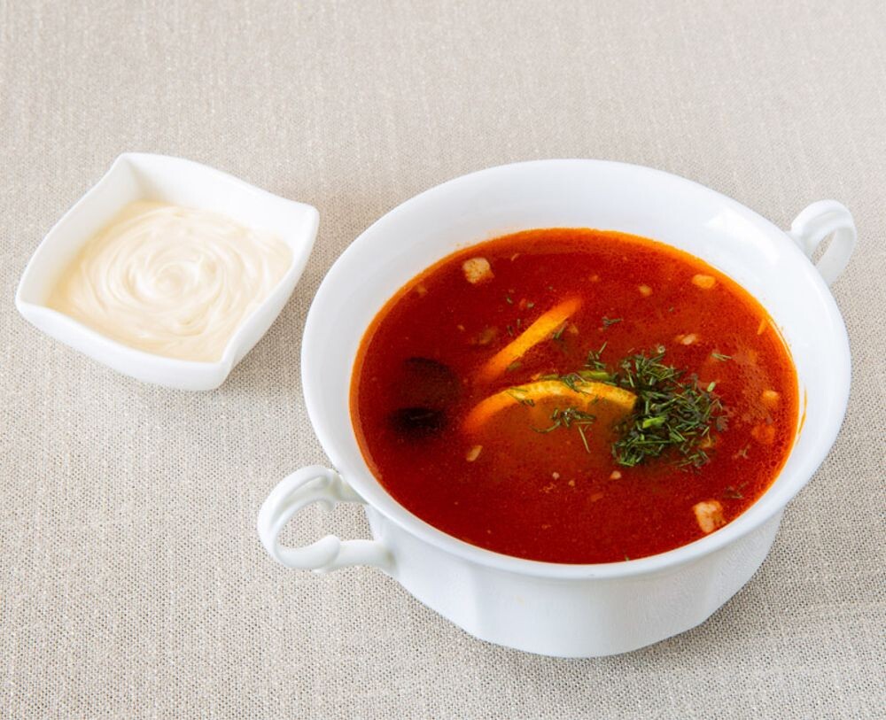 Ветчина говяжья, томаты, говядина, грудка куриная копченая, сердце говяжье, соленые огурцы, сметана, каперсы, маслины, лимон и зелень