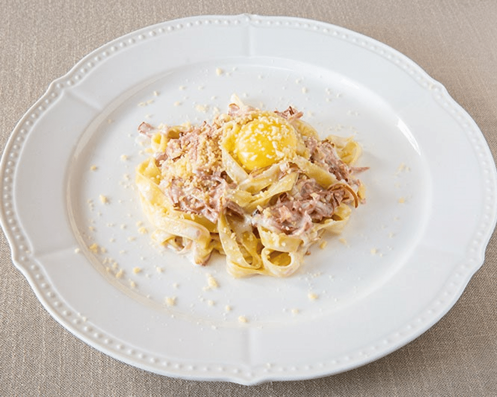 Феттучини, бекон, яичный желток, лук репчатый, сливки, сыр Пармезан
