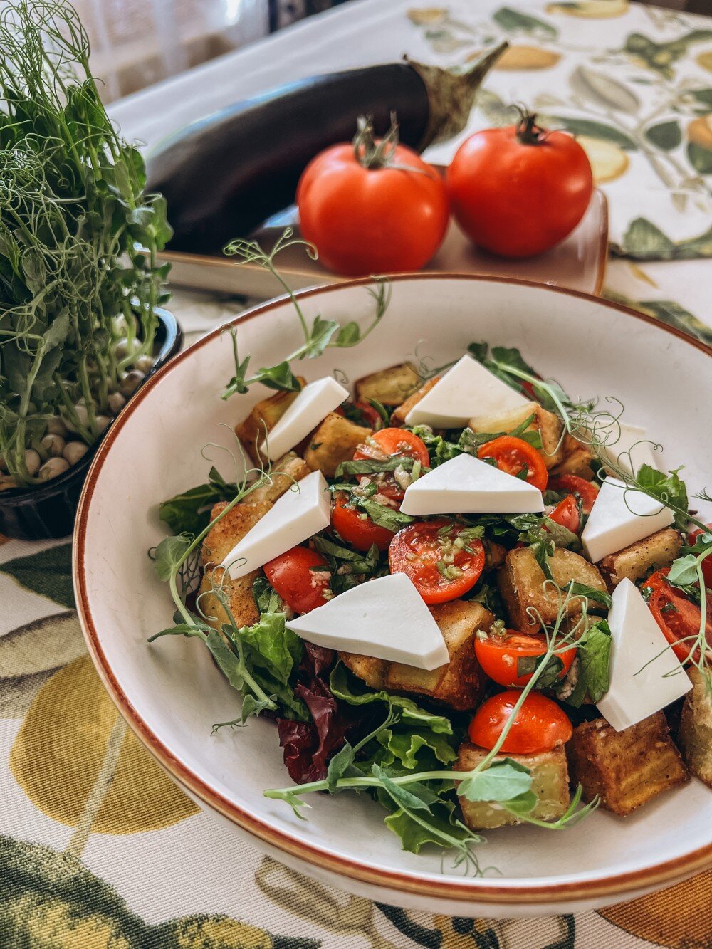 Баклажан, черри, сыр Фета, чеснок, оливковое масло, кинза, лист салата