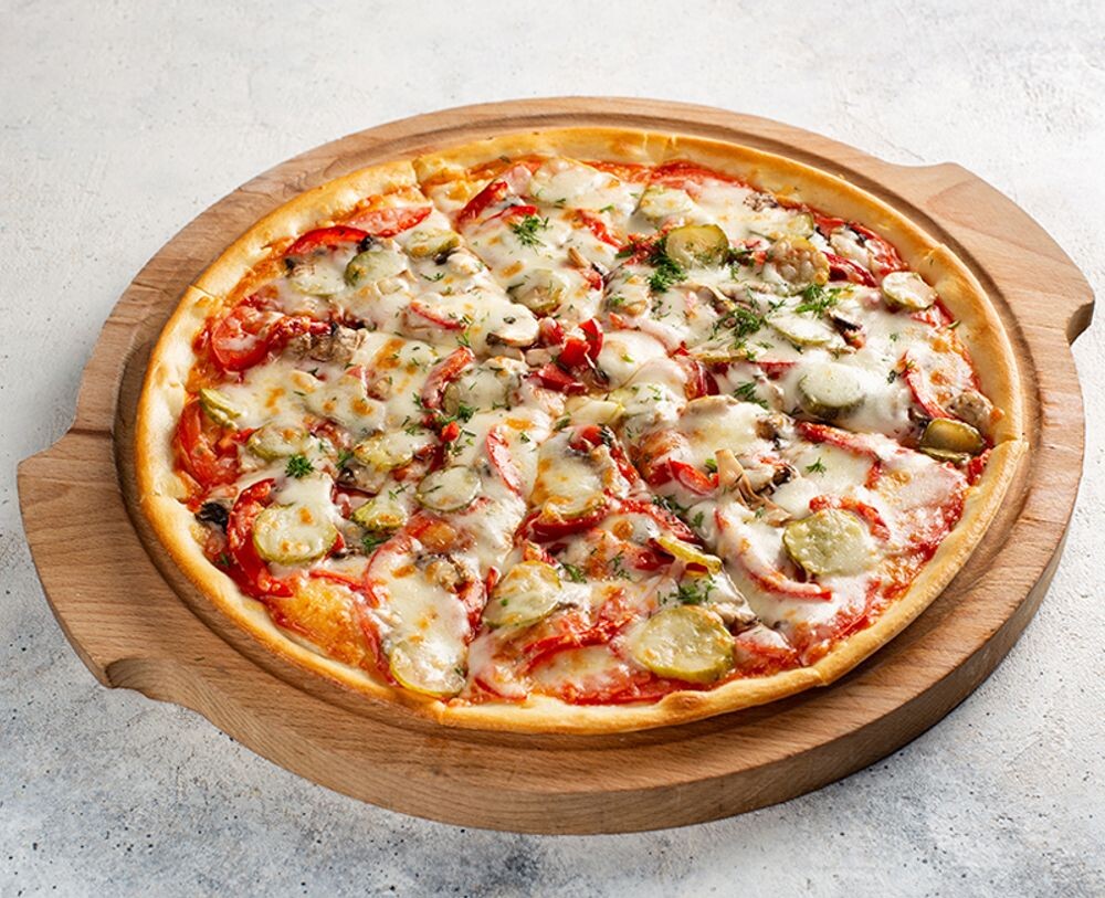 состав: тесто дрожжевое(мука,дрожжи свежие,молоко, масло растительное ,вода фильтрованная ,соль),сыр моцарелла, соус Барбекю, помидоры, шампиньоны свежие,перец болгарский,корнишоны, зелень.