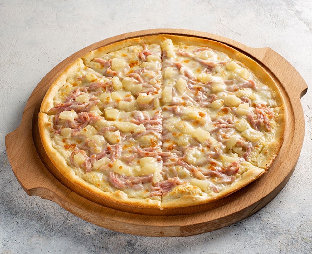 состав: тесто дрожжевое(мука,дрожжи свежие,молоко, масло растительное ,вода фильтрованная ,соль),соус Бешамель, ветчина, ананас консервированный, сыр моцарелла.