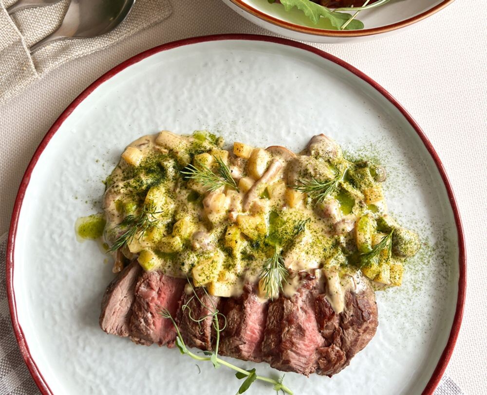 Порезанный стейк из говядины, обжаренный картофель с опятами и белым грибом со сметаной