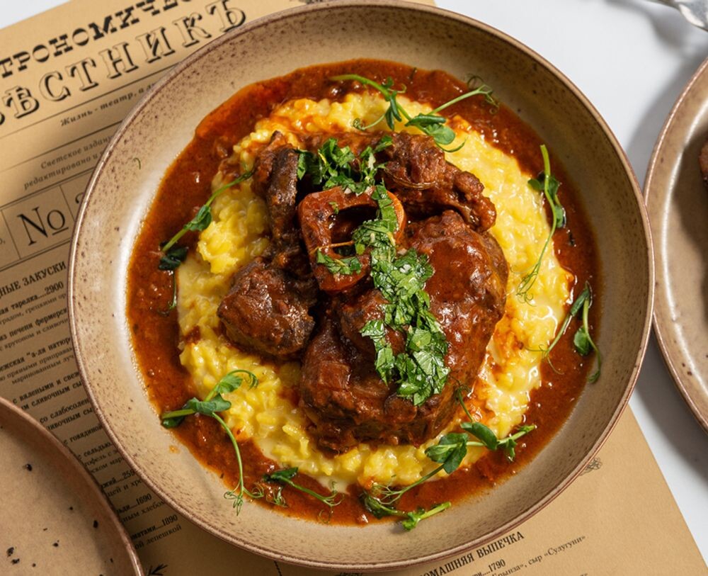 Томлёная говяжья голяшка в томатном соусе с добавлением белого итальянского вина и прованских трав на подушке из ризотто с ароматом шафрана и свежей гремолатой