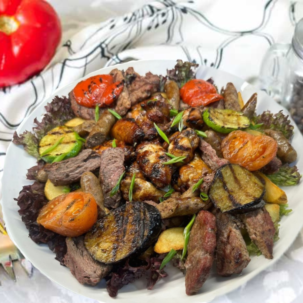 Стейк из говядины, котлета по-Милански, обжаренные охотничьи колбаски, куриные крылья в глазури, картофельные дольки, овощи гриль, перечный соус. Доставка банкетных блюд по предварительному заказу