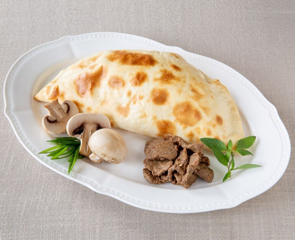 состав: тесто дрожжевое(мука,дрожжи свежие,молоко, масло растительное ,вода фильтрованная ,соль),фарш говяжий,соус бешамель,лук жаренный,грибы жаренные.