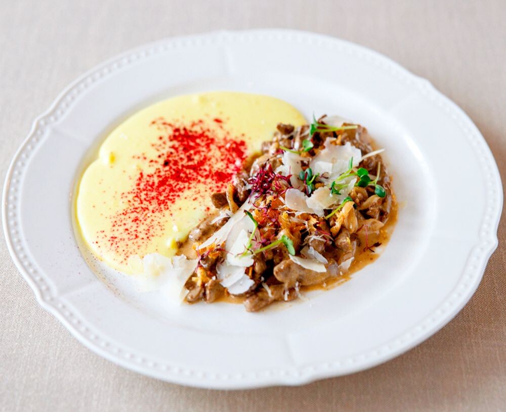 Беф-строганов с белыми грибами и картофельным кремом