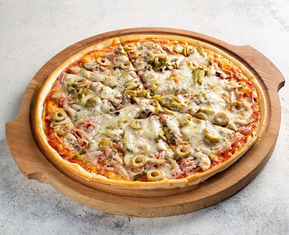 состав: тесто дрожжевое(мука,дрожжи свежие,молоко, масло растительное ,вода фильтрованная ,соль), соус томатный, шампиньоны свежие, ветчина говяжья, оливки, корнишоны, сыр моцарелла, орегано.