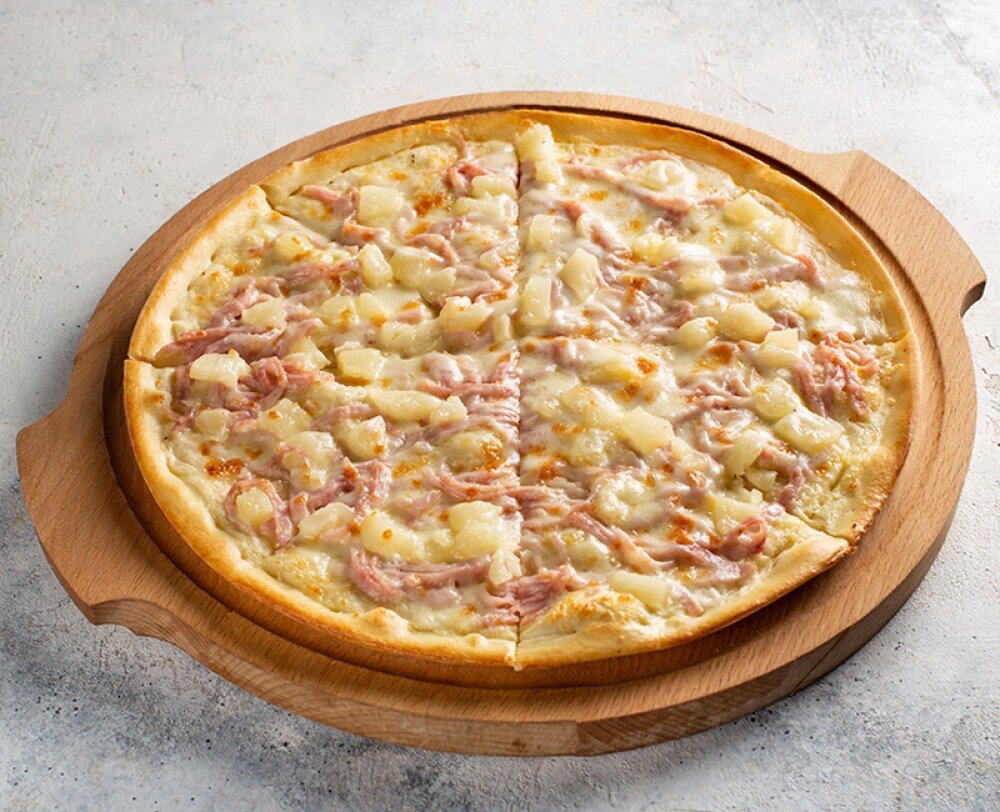 состав: тесто дрожжевое(мука,дрожжи свежие,молоко, масло растительное ,вода фильтрованная ,соль),соус Бешамель, ветчина, ананас консервированный, сыр моцарелла.