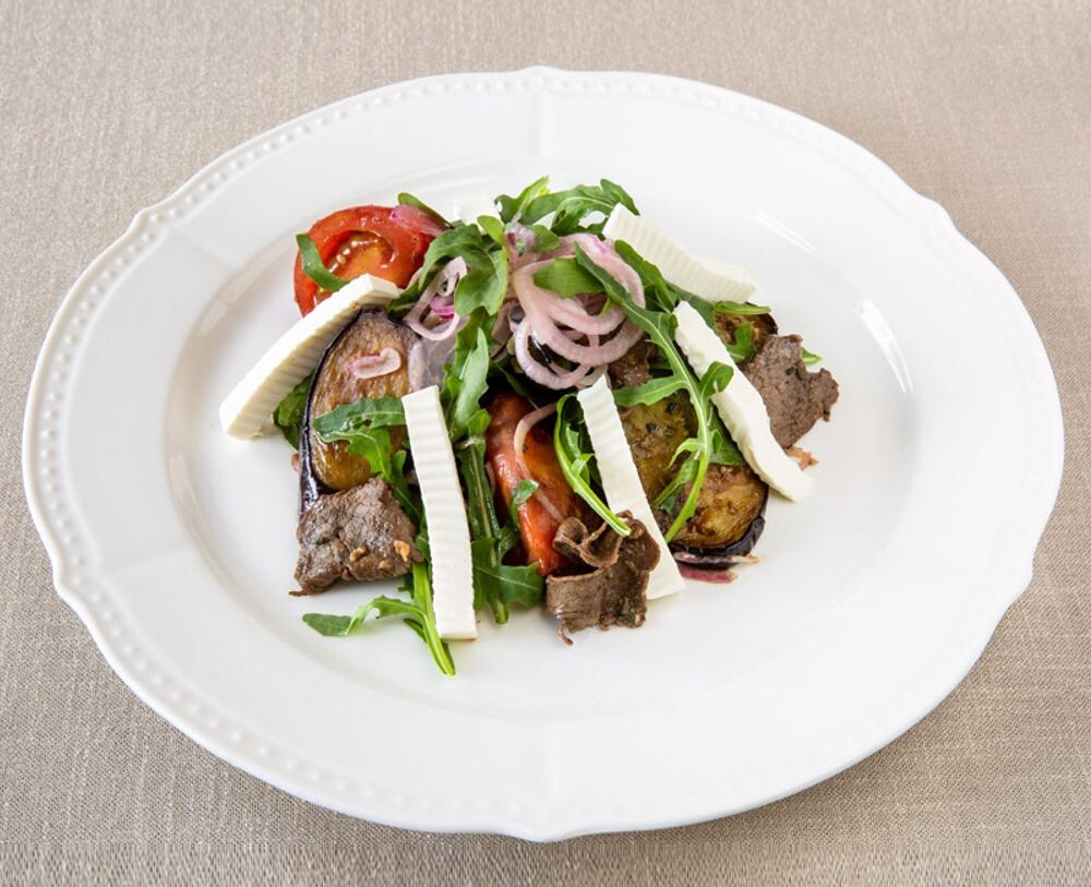 Говяжья вырезка, баклажан, помидор, сыр Фета, специи