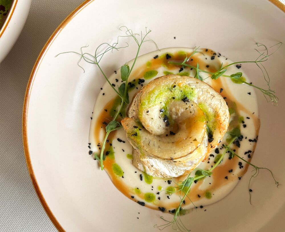 Филе судака с кремом из цветной капусты и песто