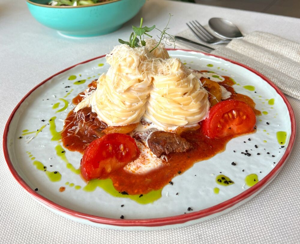 Мясо с овощами в томатном соусе, спагетти в сливочном соусе, с сыром Пармезан