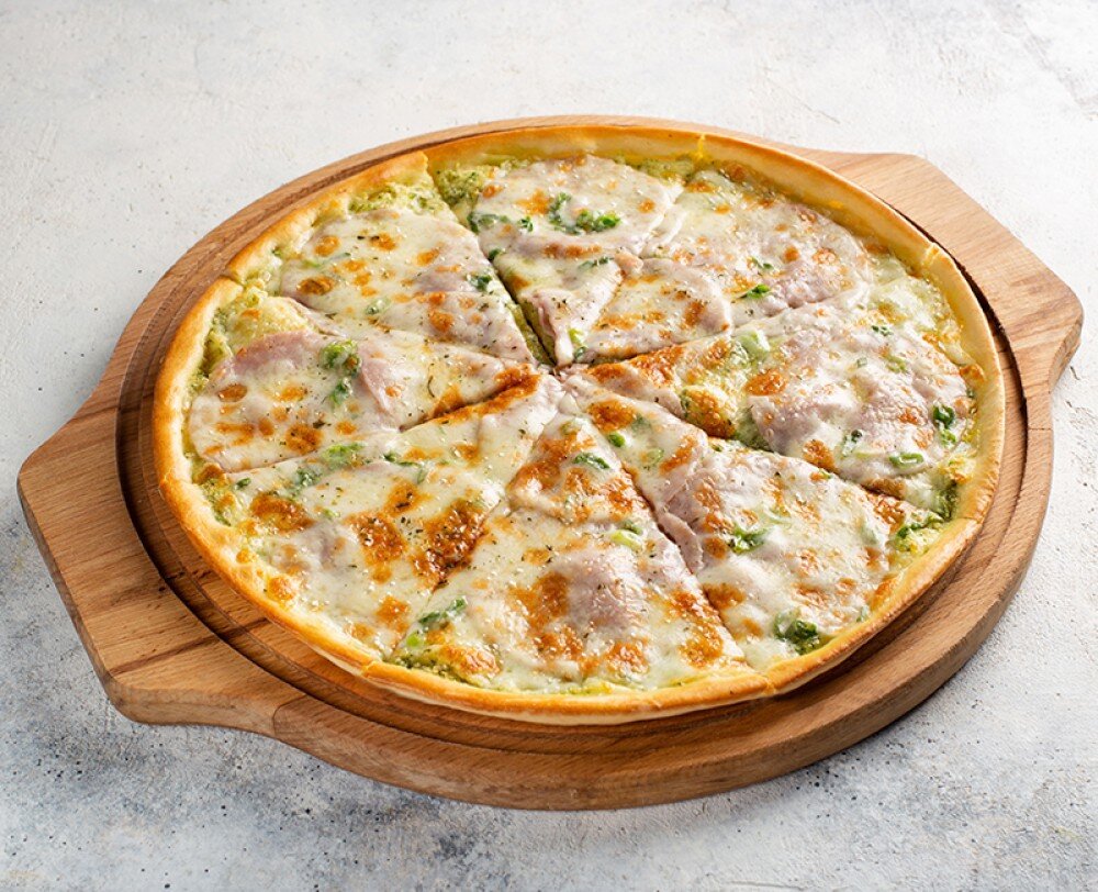 состав: тесто дрожжевое(мука,дрожжи свежие,молоко, масло растительное ,вода фильтрованная ,соль), ветчина говяжья, сыр моцарелла, орегано, лук зеленый, соус Песто с кешью