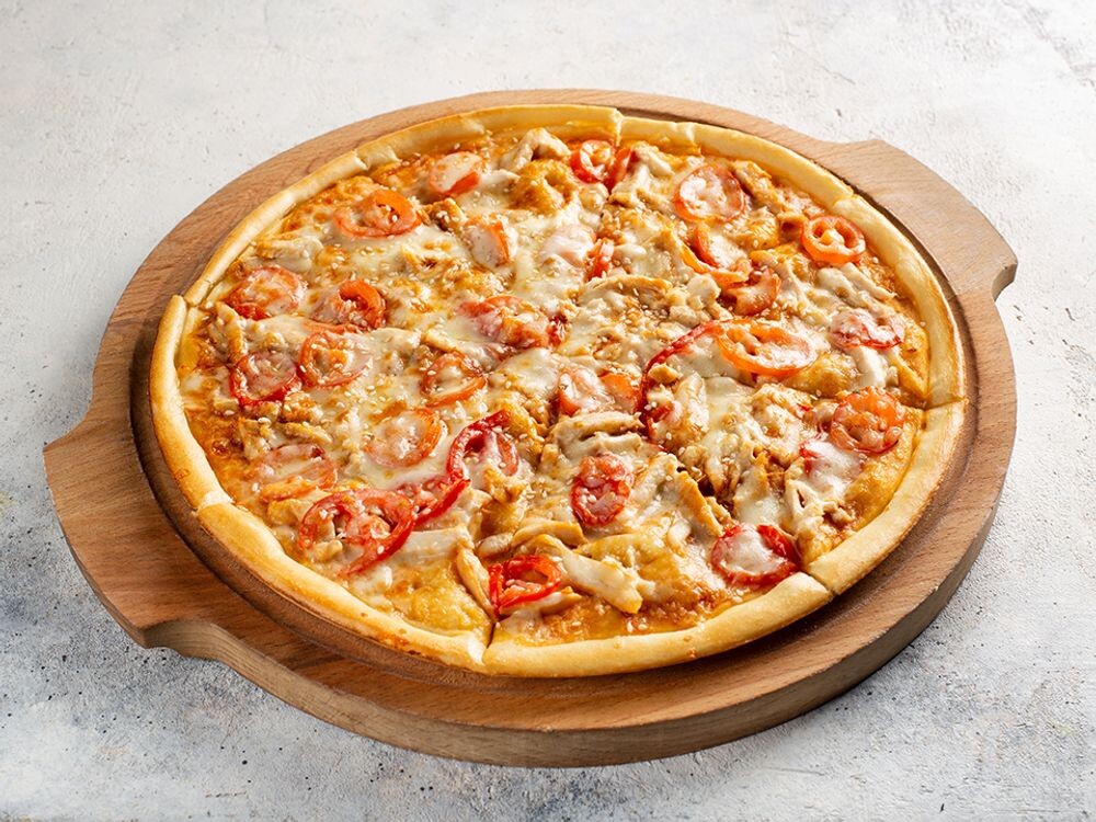 состав: тесто дрожжевое(мука,дрожжи свежие,молоко, масло растительное ,вода фильтрованная ,соль), глазурь терияки, соус Чили, грудка куриная,помидоры черри, кунжут, сыр моцарелла.