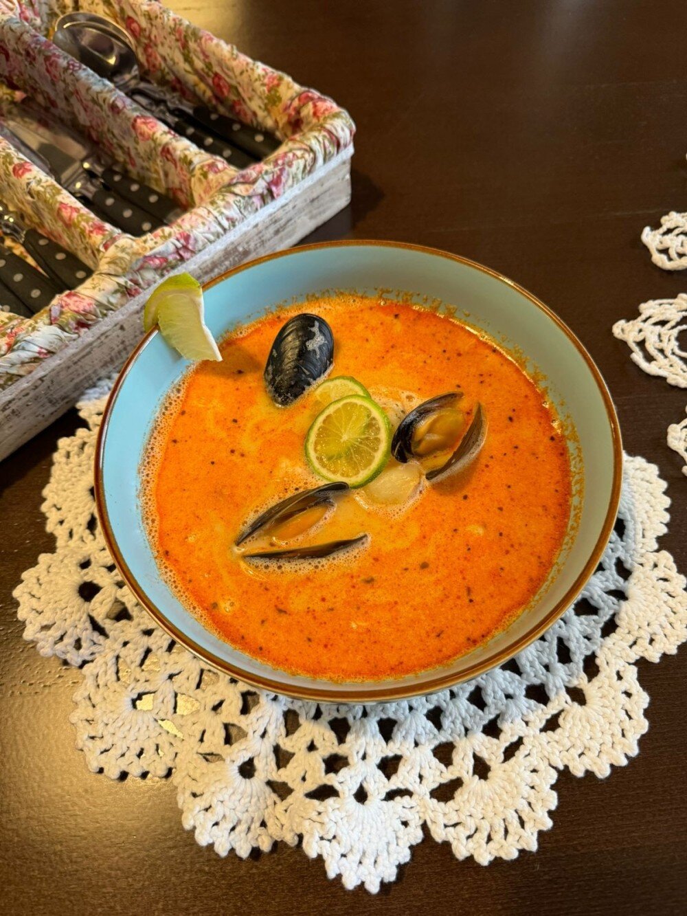 На основе кокосового молока с добавлением морепродуктов: морской гребешок, тигровые креветки, семга, мидии в створках