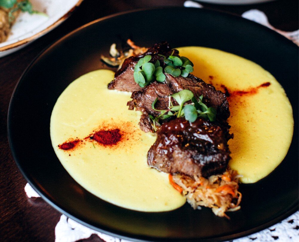 Беф-строганов с белыми грибами и картофельным кремом