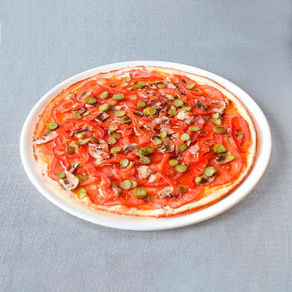 Постное тесто с соусом барбекю, шампиньонами, свежими помидорами, болгарским перцем и корнишонами. Завершаем сушёным базиликом для яркого аромата.