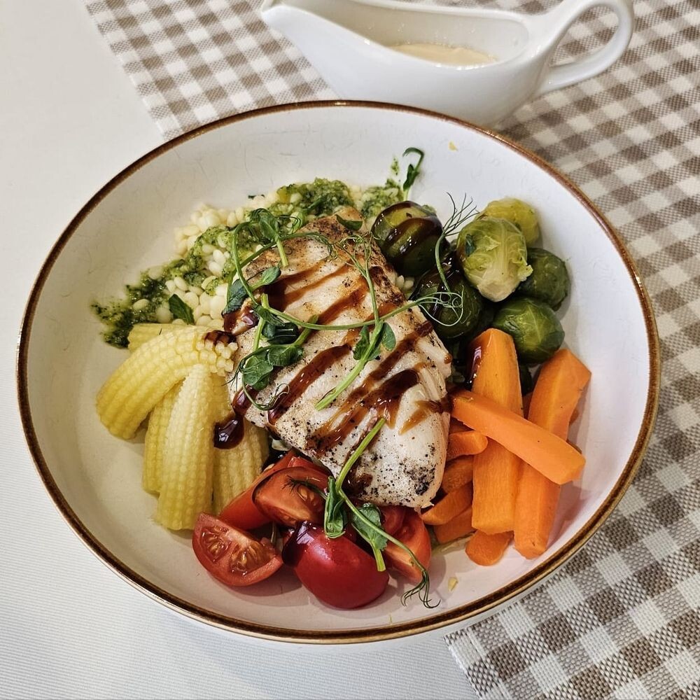 Паста Птим- птим с соусом из анчоусов , Куриная грудинка , брюссельская капуста, морковь, початки кукурузы, салат айсберг