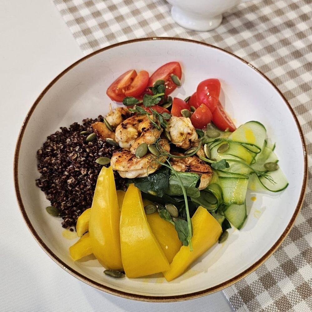 Киноа с ореховым соусом , тигровые креветки , свежий шпинат , огурец, болгарский перед , помидоры черри