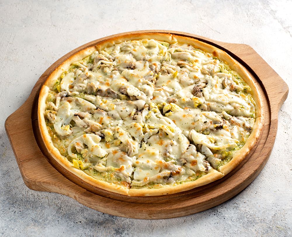 состав: тесто дрожжевое(мука,дрожжи свежие,молоко, масло растительное ,вода фильтрованная ,соль), соус песто с кешью, шамьпиньоны свежие, грудка куриная, сыр моцарелла, яйцо куриное.