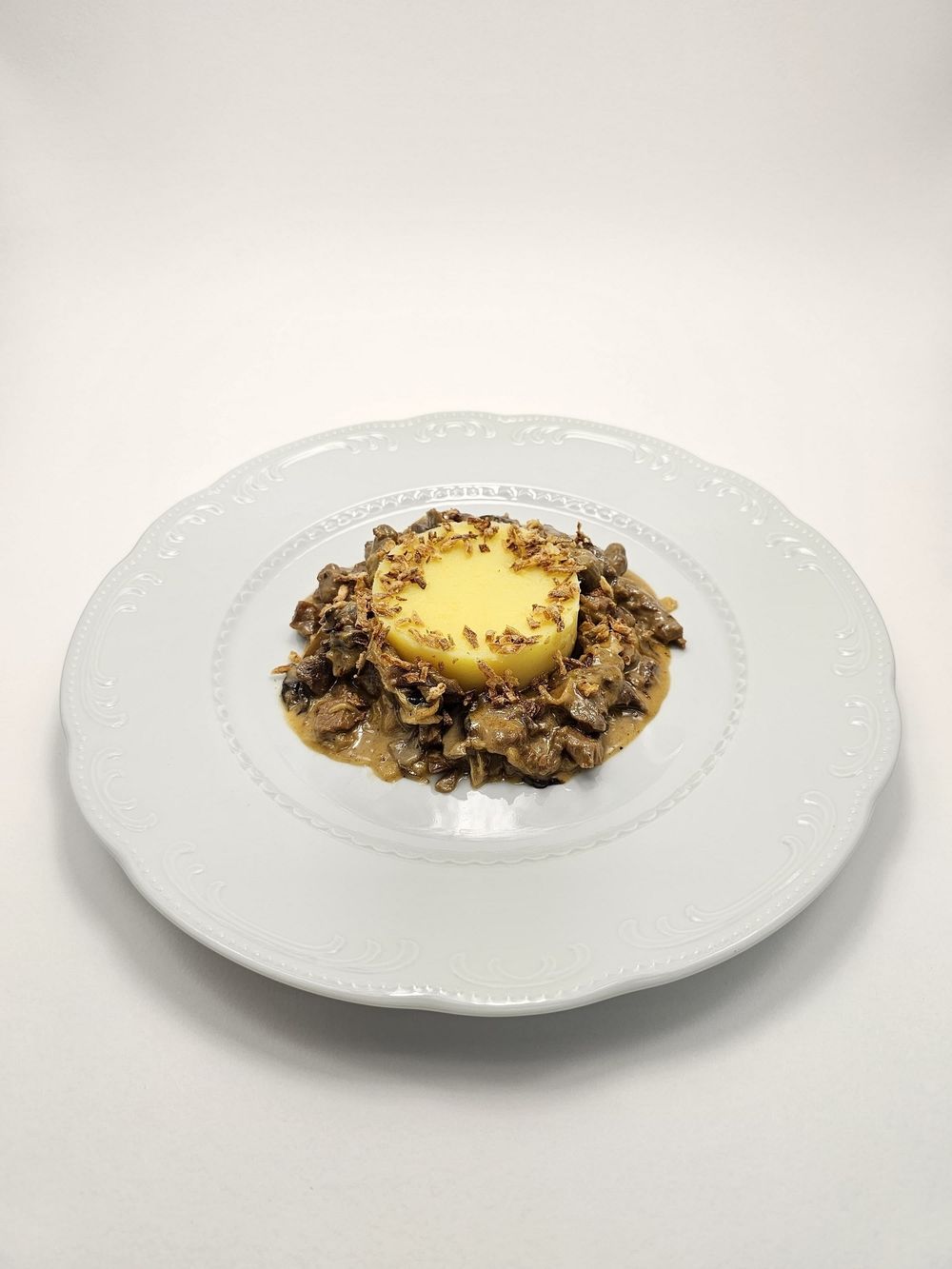 Беф-строганов с грибами и картофельным пюре