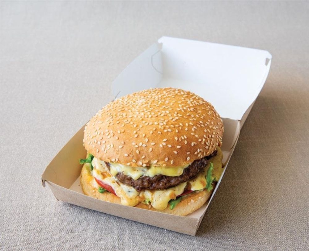 Булочка с кунжутом, говяжья котлета, помидоры, корнишоны, красный лук, салат Айсберг, сыр Чеддер, соус горчичный, соус блю-чиз