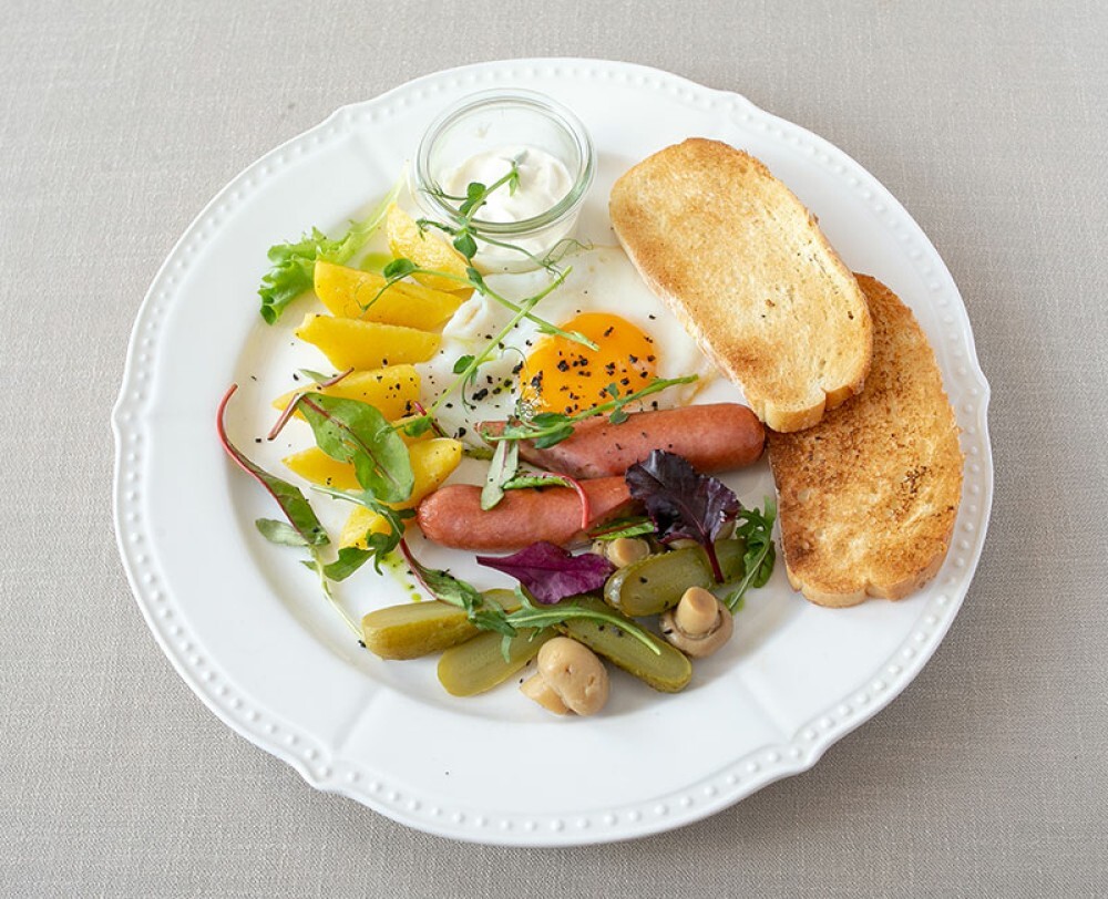 Глазунья с обжаренными сосисками, жареным картофелем, подается с корнишонами, маринованными грибами, чиабаттой и сметаной