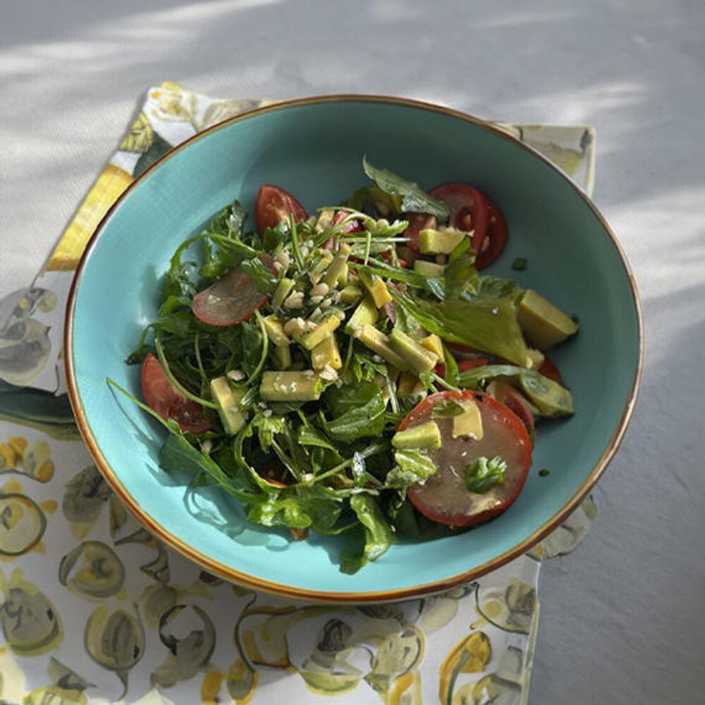 Свежая руккола с лёгкой пикантной горчинкой, хрустящий редис, сладкие томаты черри и нежное авокадо. Завершаем ароматным оливковым маслом и кедровыми орешками для тонкого орехового вкуса.