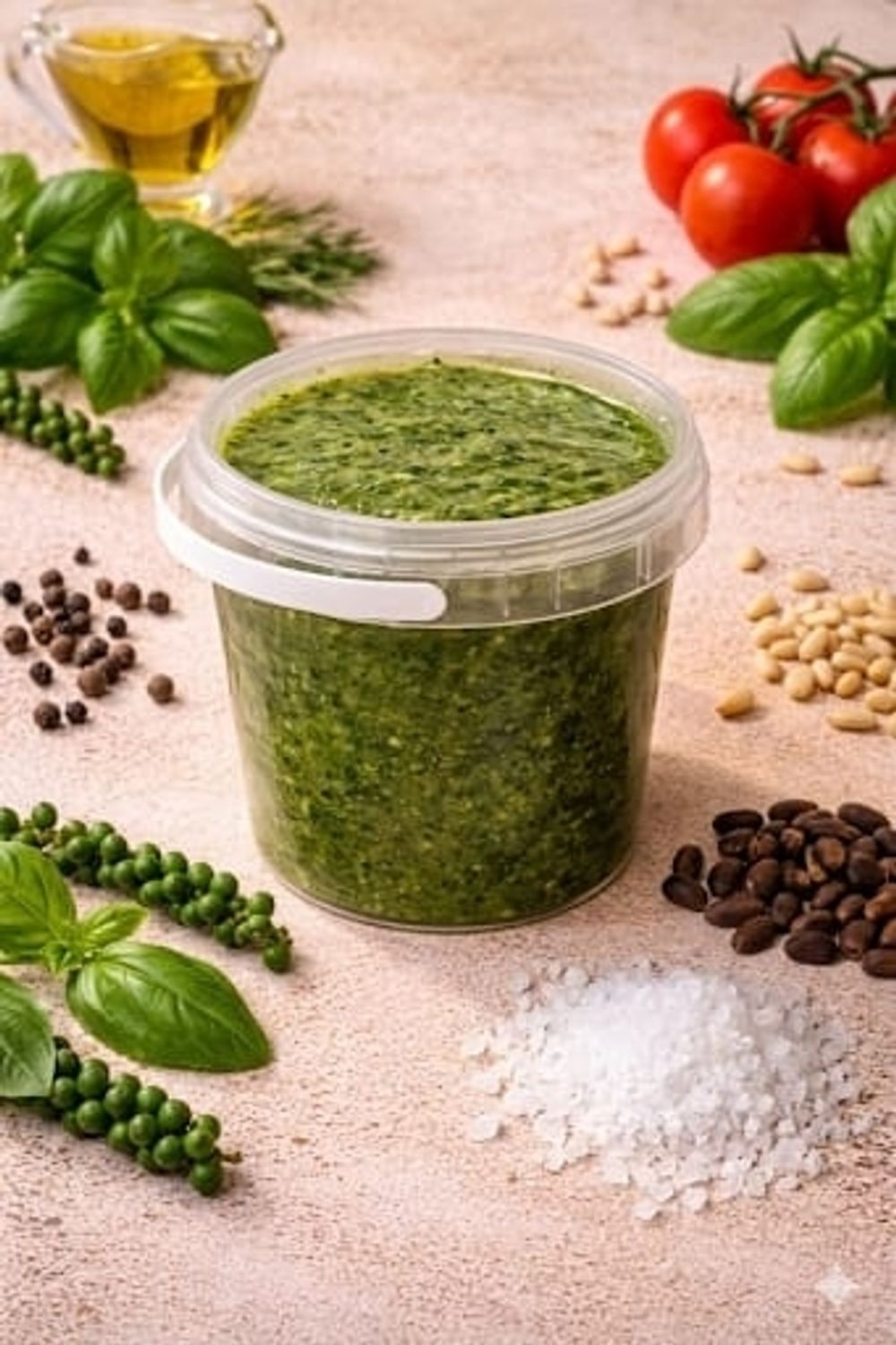 Соус на основе зелени( базилик, петрушка), оливкового масла, орехов кешью, сыра Пармезан, чеснока и растительного масла .