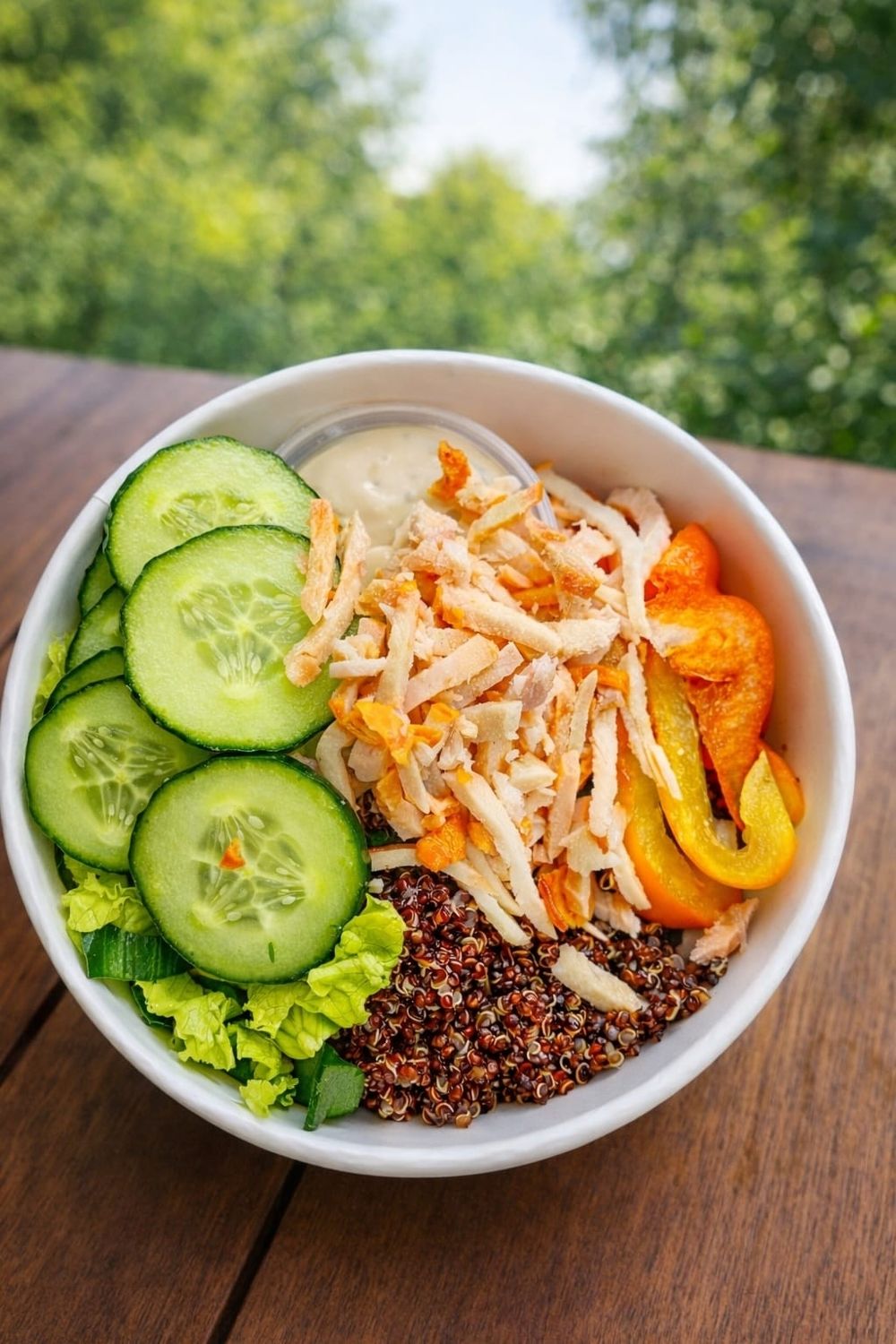 Лёгкий, сбалансированный боул с выразительным вкусом копчёной куриной грудки, свежих овощей и ароматной киноа. Нежная копчёная грудка, сочный болгарский перец и свежий огурец сочетаются с молодой зеленью шпината и красного листового салата. Рассыпчатая киноа придаёт текстуру и питательность, а насыщенный кунжутный соус объединяет ингредиенты в гармоничную композицию.