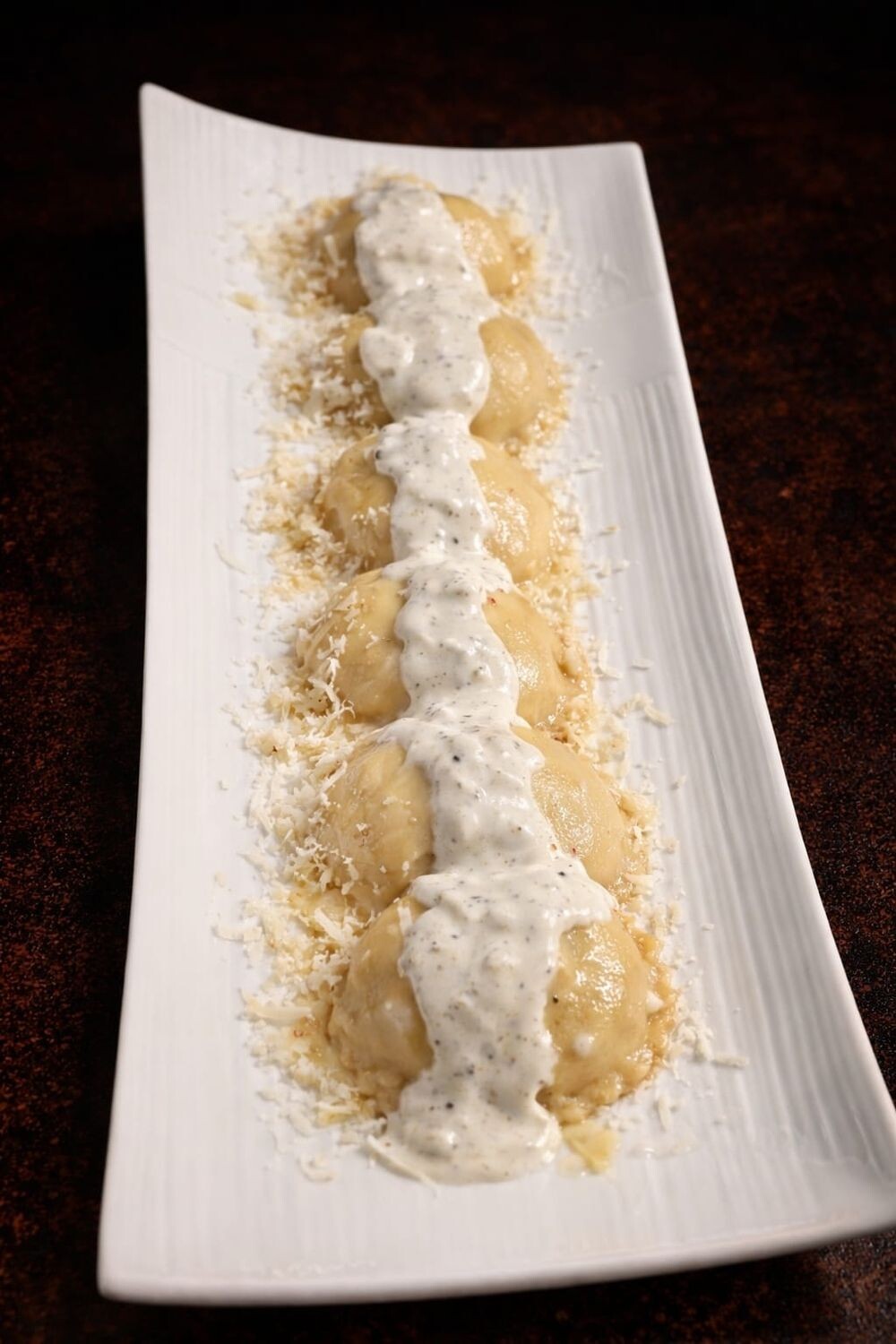 Сытные равиоли с говядиной в сливочно-грибном соусе.